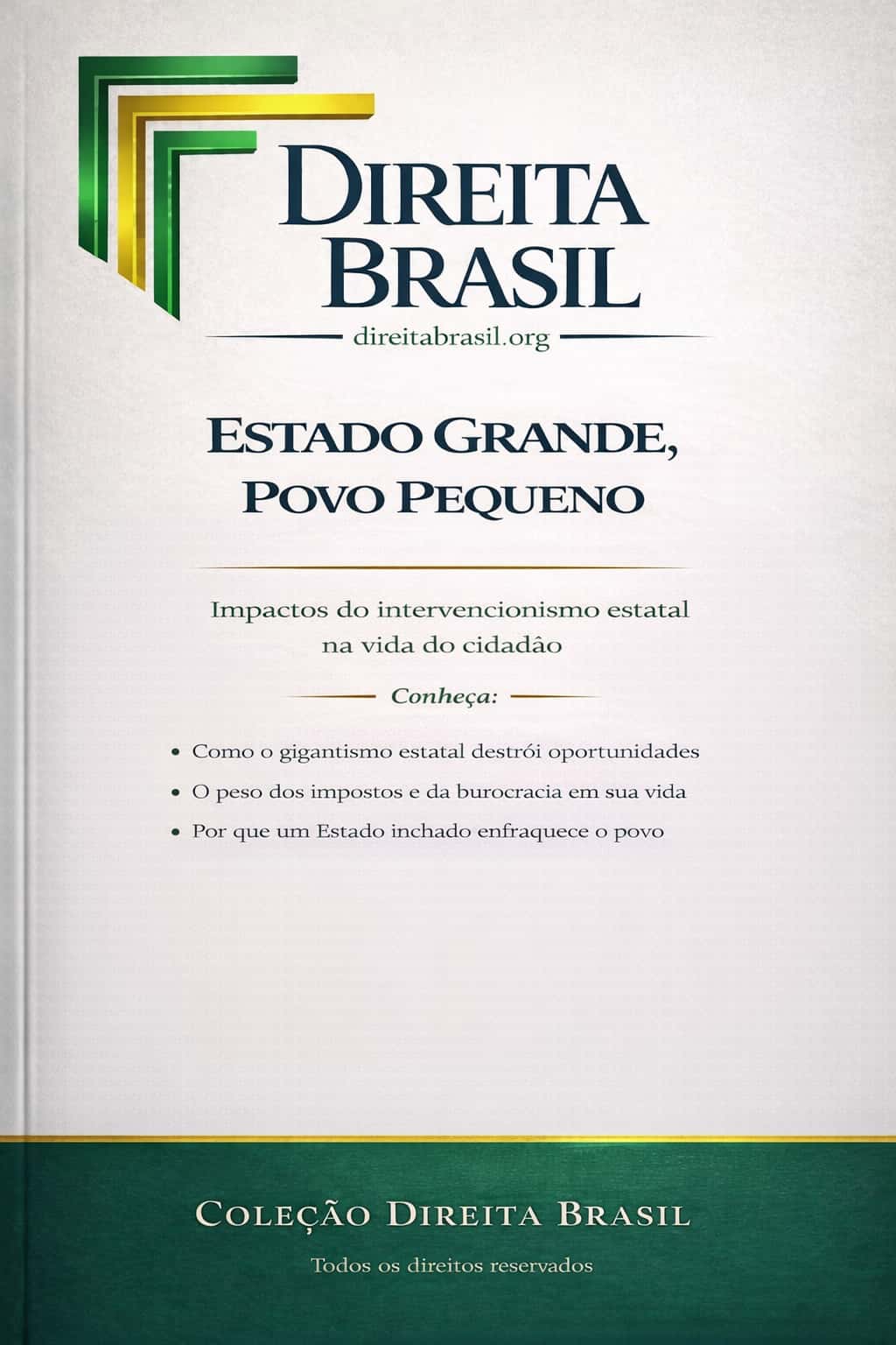 Estado Grande, Povo Pequeno analisa de forma clara e objetiva como o gigantismo estatal, o excesso de impostos e a burocracia afetam diretamente a vida das pessoas, limitando oportunidades, sufocando a iniciativa individual e enfraquecendo a sociedade civil.